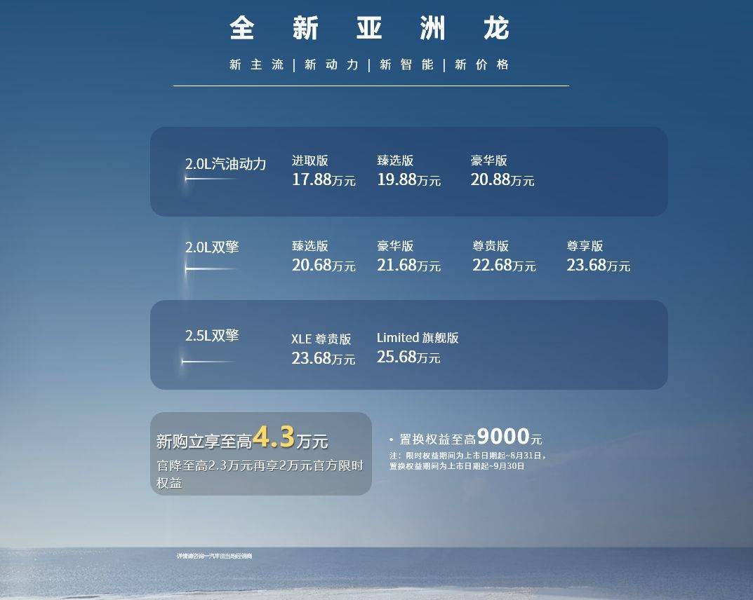 产品实力全面升级,新价格更让人惊喜。全新亚洲龙新购立享至高4.3万元。此外,置换用户还可享至高23000元补贴,以极致诚意的价格,带给用户更美好的用车生活。